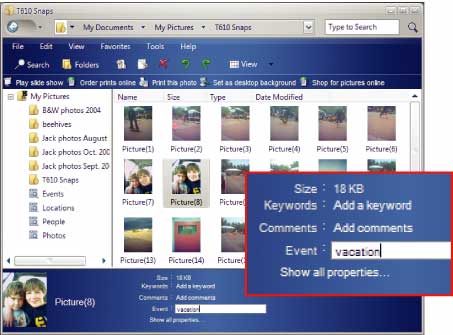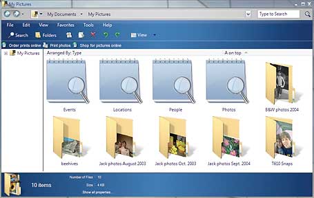 But even though WinFS is now out of the mix, Microsoft has taken advantage of file attributes in the NTFS file system already available in Windows XP to make Explorer better at ferreting out documents according to author, camera model (for photographs), or genre or album title (for music files). The operating system lets you create virtual lists based on these attributes so that, for example, you can see every photo on your system or all Microsoft Word files, regardless of where they are stored and without having to explicitly search for them.