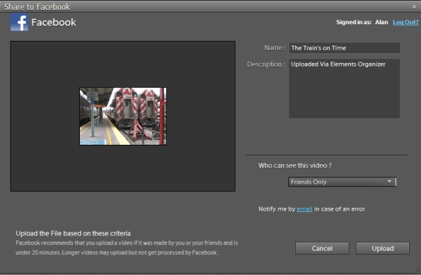 Premiere Elements 9's Facebook video upload feature.The video-focused complement to Photoshop Elements 9, the new version of Adobe's image-editing application, Premiere Elements 9 lets you easily upload finished videos to Facebook (the program first acquired YouTube-upload capability in Premiere Elements 8).You can't send your freshly edited video directly from Premiere Elements to Facebook, however; instead, you must save it, return to the Elements organizer (a separate application), find the video, and then use commands in the organizer to upload the video. It's easy to do once you're in the organizer, and the process works very well, but I'd rather use a more consistent interface, so I wouldn't have to remember to use YouTube in the editor and Facebook in the organizer.