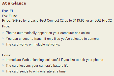 Eye-Fi cards, which are available in four different models ranging from $50 to $150, will send files to a Web location of your choice, including social sites like Flickr, Picasa and Facebook, as well as printing-oriented spots such as Kodak Gallery and Shutterfly. You can choose to keep your destination albums private until you make them public, or set the card to upload only the images you've chosen in your camera.