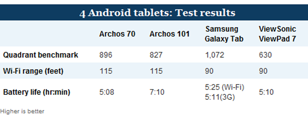 To see how the first Android slates stack up against each other, I looked at four tablets: three with 7-in. screens -- the Archos 70 Internet Tablet, the Samsung Galaxy Tab and the ViewSonic ViewPad 7 -- and the 10-inch Archos 101 Internet Tablet. I also checked out HP's PhotoSmart eStation C510, an inkjet printer with a Zeen wireless Android tablet included.