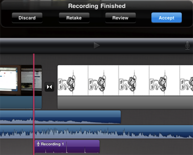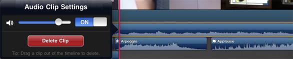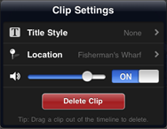 Unfortunately, the app still lacks a lot of iMovie '11's audio prowess. While you can view audio waveforms on the iPad, there's no way to individually adjust or split audio clips; you're stuck with a master volume control for each clip and an on/off button. Neither can you separate audio from a clip--though you can switch off the audio entirely.