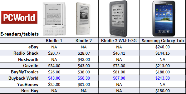 How the buyback services compared: Kindles and Galaxy Tab.Kindles and Galaxy Tab: BuyBackWorld