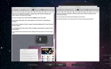 If an item you deleted yesterday has suddenly become important today, you choose Revert to Saved from the File menu, and enter Versions' spacey Time Machine-style interface. On the left side of the screen is the current version of your document; on the right are all previous versions. If you think everything you've done in the document recently was a colossal mistake, you can navigate back to a previous version and click Restore to entirely replace your current version. If you only want to grab a snippet out of that previous version, you can do that too, by navigating back to a previous version, selecting the snippet, and just copying it out and pasting it into your current document.
