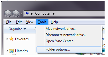 2. Click Tools, Folder Options... in the File menu. (Note: Windows Vista and 7 turn this menu off by default, so first you may need to press the Alt key to enable the menu.)