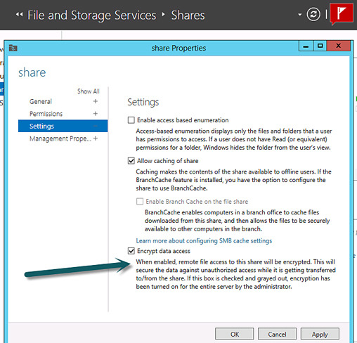 Adding support for the encryption of Server Message Block data on untrusted networks requires admins to simply turn it on per-share via the Server Manager File and Storage Services node.