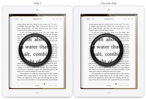 Though the new screen's 264-ppi pixel density is lower than that of the iPhone 4 and 4S (326 ppi), Apple argues that both are Retina displays because you generally hold an iPad farther from your eyes than a phone. This blog post by astronomer Phil Plait, who did the math, seems to agree.
