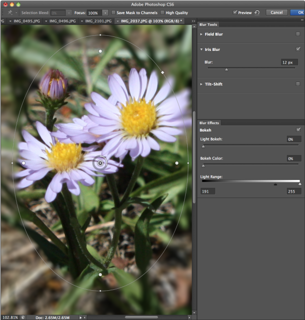 Added to Photoshop CS5's 11 Blur plug-ins is a new Blur Gallery consisting of Field Blur, Iris Blur, and Tilt-Shift. These on-image controls add blurs to any image without requiring selections, layers, or depth maps. Iris Blur creates a shallow depth of field and lets you control the blur's area and intensity. Field Blur lets you pinpoint (with a virtual pushpin) the parts of an image you want blurred and control blur intensity. The Tilt-Shift blur applies blurs along one or more planes, letting you adjust both location and intensity, like the popular Lensbaby tilt-shift lens. You can also apply and adjust a bokeh (background blur) effect with any of the three new Blur tools. The Blur Gallery offers a full-screen preview with collapsible panels, allowing you to see your results at a respectable size.