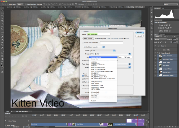 Photoshop CS6's new video functionality--designed as a starting point for video creation--features a new Timeline panel in addition to Photoshop's familiar Animation panel. The workflow, targeted to photographers, includes letting you create, edit, splice, and add audio track and transitions to your clips in a drag-and-drop interface. Having all Photoshop's editing tools at your disposal offers manifold artistic options. You can then export and render video in a number of formats.