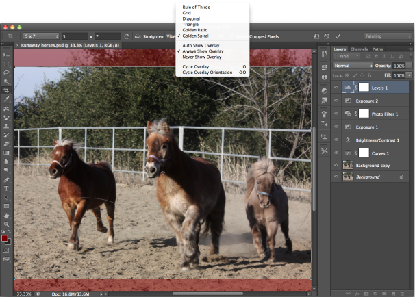 Photoshop CS6's GPU-enabled, nondestructive Crop tool sports new composition controls. Whereas CS5 included a basic grid and Rule of Thirds overlay, CS6 lets you preview Golden Ratio, Diagonal, Triangle, and Golden Spiral overlays. You can also use the new Perspective Crop tool to straighten images. The new Crop tool is designed to help you change the aspect ratio (shape) of your image more easily, without accidentally changing the resolution and thus the image quality.