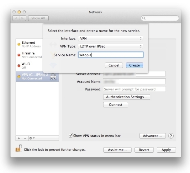 Witopia: Witopia has two services: personalVPN (Basic), which costs from $6 per month to $50 per year, and personalVPN Pro ($40 for 6 months or $70 for a year). Both versions support PPTP, L2TP-over-IPsec, and the Cisco flavor of IPsec used by iOS. The Basic flavor excludes a desktop SSL option, which may be needed in some countries or networks. Witopia provides unlimited bandwidth. WiTopia offers a desktop VPN management program that handles connections, bypassing the Network preference pane. But it also provides manual setup guides for mobile and desktop operating systems.
