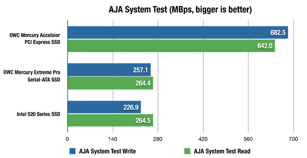 To test this drive (we tested the 480GB version), we inserted it into an available PCI slot in a Mac Pro, and booted off an Intel 520 Series SSD, using the Accelsior as an secondary drive. To get a feel of the 520's performance, we ran it through the AJA System Test, and it yielded an average 226.9 MBps write and 264.5 MBps read time.
