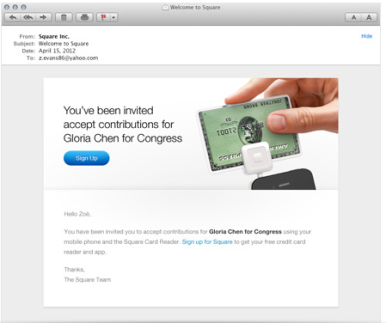 Fridays announcement opens up Squares services to federal candidates of all stripes. Users must register with the company in order to receive the card readers, which plug into the audio jacks of iPhones and iPads. The app itself is free, and compatible with all devices running iOS 4.0 or later.