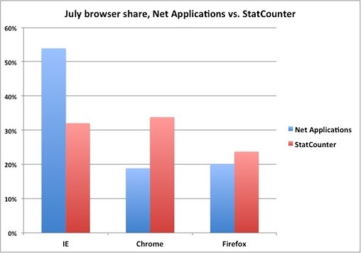 Their estimates for IE were simply irreconcilable. Net Applications said IE had a July share of 53.9%, but StatCounter pegged the browser at 32%, a 21.9 point difference. The gap between their July results was larger than the month before.