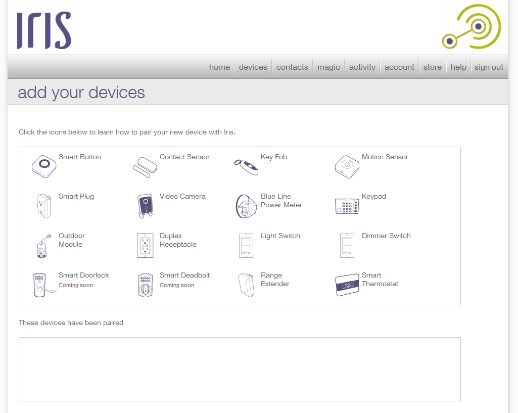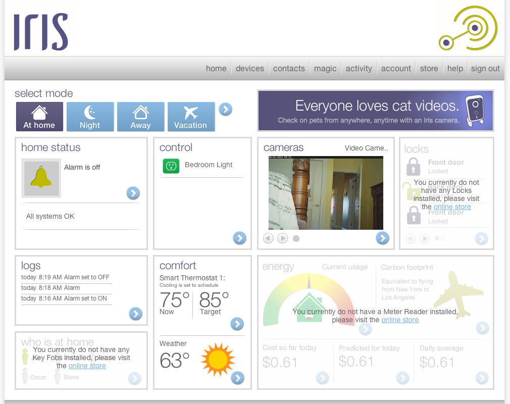 Iris maintains a skimpy history of events; the history is limited to the dates and times when the alarm system was turned on or off and when intrusion or panic alerts were triggered. It will also identify whether the alert was triggered from the keypad, the website, the door/window sensor, or the motion sensor. Iris keeps track of the number of text messages and email messages that it sends each month, too; but the history doesn't record when door/window sensors are opened and closed, when the motion sensor gets tripped, when the camera records video, when the thermostat's programming gets changed or overridden, or which users have logged into the system from the Web. If you use the Basic (free) service plan, the history will log only the three most recent events.