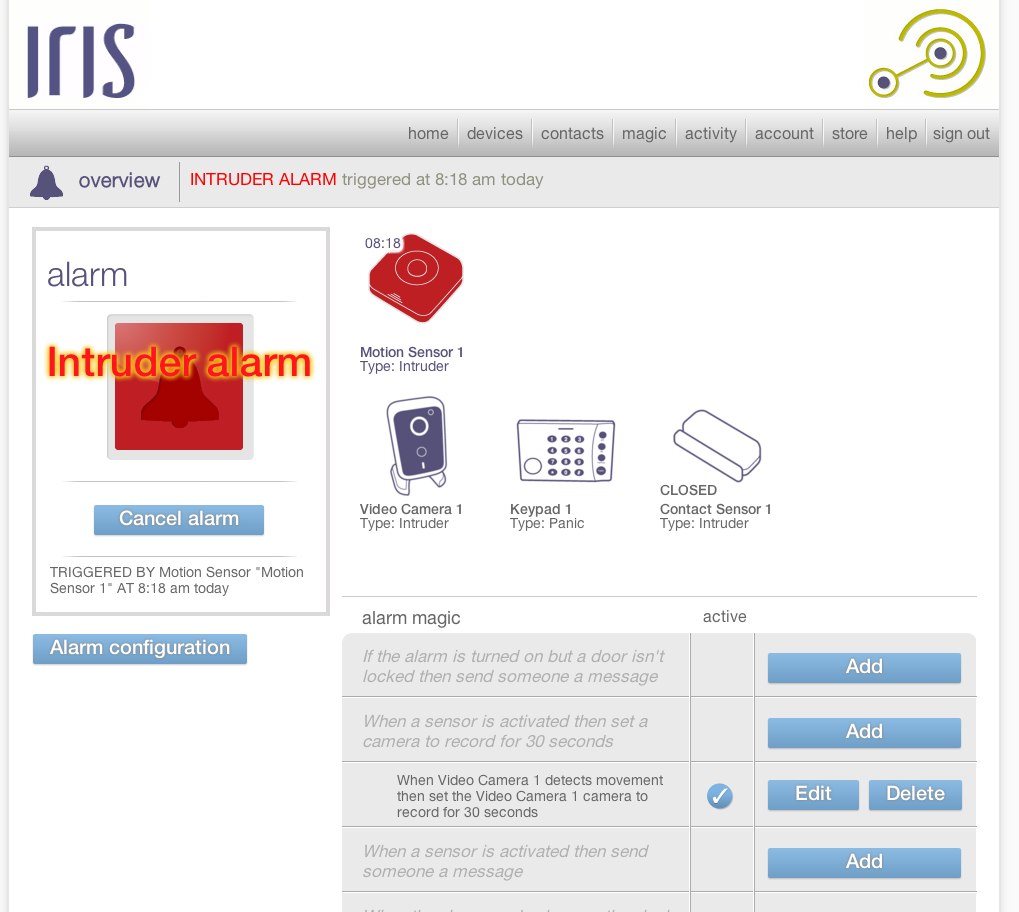 Iris should also be able to alert you when events don't happen within an expected timeframe. If you have a latchkey child who should be home at 3 p.m. each weekday, for example, the system should generate an alert if the alarm system isn't disarmed by, say, 3:15 on those days, indicating that someone has entered the home.