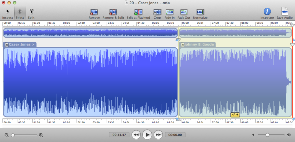 To combine two tracks in Fission, open the first one, then click at the right-most end of the window. Find the second file and drag it onto the Fission window, over the red line that marks the playhead position. Save the file and add it to your iTunes library.