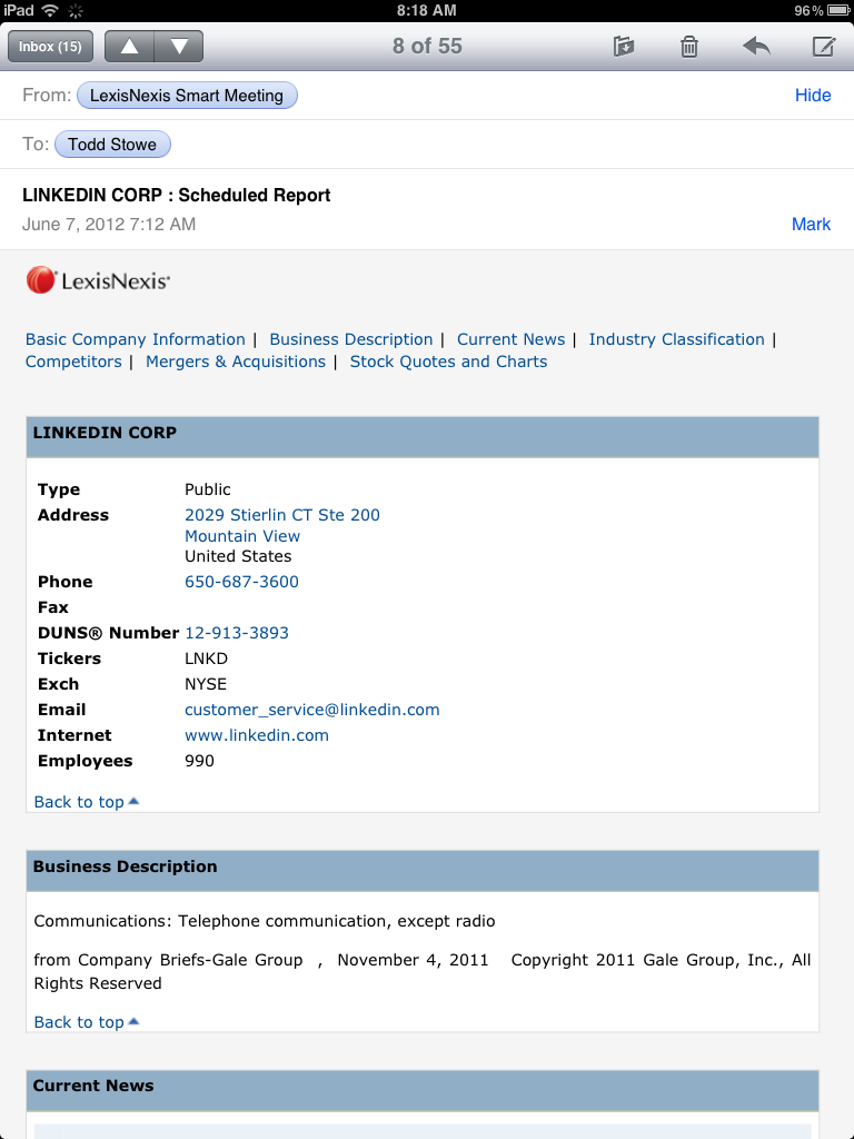 LexisNexis Smart Meeting can deliver relevant information directly to your iPad.The LexisNexis Smart Meeting service pulls relevant information from LexisNexis—a comprehensive source of company and industry news—and delivers a report to prepare sales and business professionals for client meetings. LexisNexis Smart Meeting integrates with the calendar in Microsoft Outlook to push breaking news and up to date company information immediately prior to scheduled meetings to give sales and business professionals an edge over the competition.